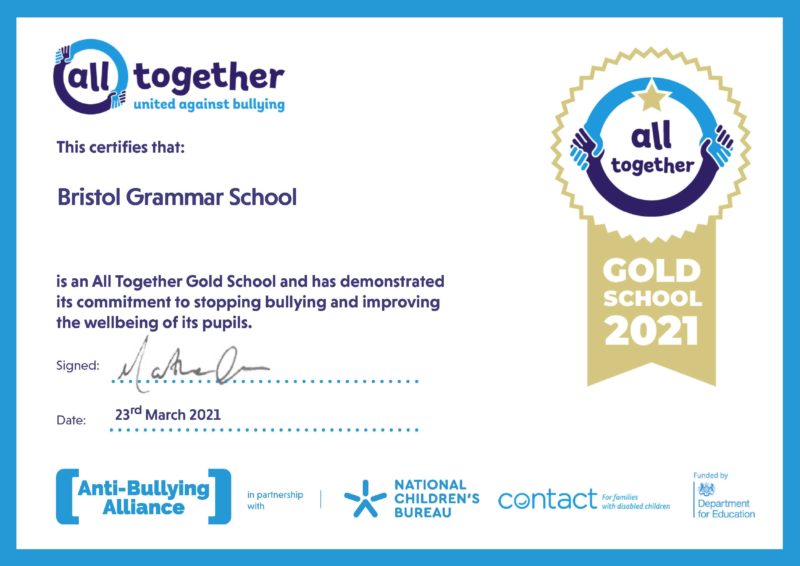 We are delighted to announce that Bristol Grammar School has been awarded the All Together award with gold status. This award recognises our work to promote anti-bullying and our positive approach to improve the wellbeing of pupils. The All Together Gold School status demonstrates BGS’s continued commitment to these very important pastoral areas.