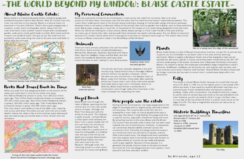 Miranda said “I decided to focus on Blaise Castle estate, because it’s close to my home and there are many acres of woodland as well as other really interesting features such as the rock structures, folly and museum. I would often go there to research and admire nature. I studied the rock formations and also the human geography of the area, for example how the park is used and the estate’s foundations.